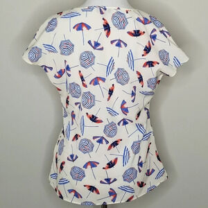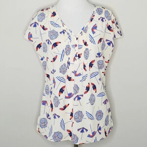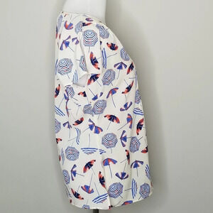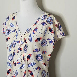 Talbots umbrella print short sleeve blouse. White with blue and red umbrellas. Split sleeves. Pintuck and button detail at front. Excellent preowned condition.