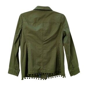 Talbots Utility Jacket Womens Small Petite Pom Pom Hemline Trim Green Button Up