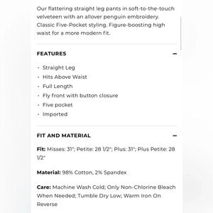 Talbots VELVETEEN STRAIGHT LEG PANTS - EMBROIDERED PENGUINS Plus Size 16