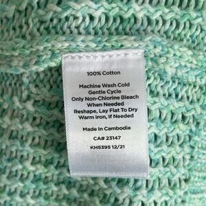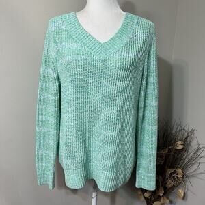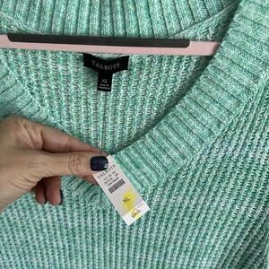 This Talbots V-Neck Sweater in XL size is a stylish and comfortable addition to any woman's wardrobe. The sweater features a green and blue striped pattern, long sleeves, and a classic pullover style. Made from 100% cotton with an open-knit fabric type, this sweater is perfect for casual occasions during the winter and fall seasons. The breathable material ensures a comfortable fit, while the brand quality guarantees durability and a timeless classic look.