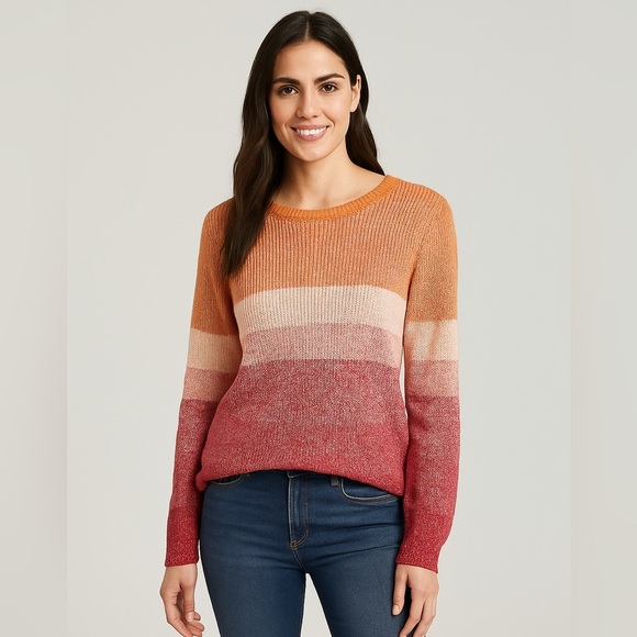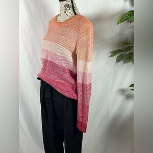 Eye-catching sweater with vibrant gradient design. Features warm pink and orange tones. Ideal for adding color to your wardrobe.