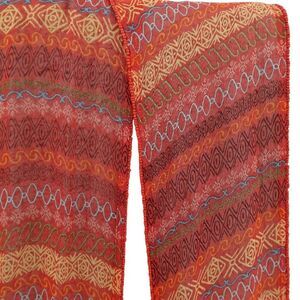 Enhance your outfit with Talbots vibrant geometric pattern beaded scarf, featuring bold red and orange hues. Measuring 4.5" x 72", it offers a lightweight and elegant design perfect for both casual and formal settings.