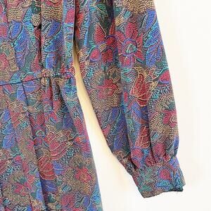 FEATURES: vintage midi dress, beautiful bold floral print made from small dots, elastic waist easily stretches to 16” (and more), pleated at the neckline, wrap style top buttons at the left shoulder, shoulder pads (which can easily be removed)