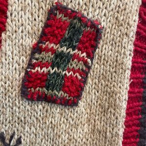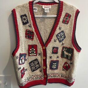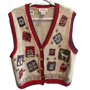 Talbots Vintage Christmas Knit Vest Fair Isle XL Snowflake Deer Tree Button Up Discover festive charm with this vintage Talbots Christmas Knit Vest. Crafted for comfort and holiday spirit, this XL vest features a delightful array of embroidered patches showcasing classic Christmas motifs including snowflakes, reindeer, Christmas trees, and festive plaid patterns. The cream-colored knit is accented with a rich red and navy trim along the v-neck and hem, adding a pop of color and defining its classic silhouette. This sleeveless cardigan style vest is perfect for layering over your favorite long-sleeved tops or turtlenecks during the holiday season, embodying the quintessential ugly Christmas sweater aesthetic with sophisticated flair. The Talbots brand is known for its quality and timeless design, making this a cherished addition to any holiday wardrobe. KEY FEATURES & BENEFITS: * Festive Christmas Motifs: Adorned with charming embroidered patches of snowflakes, reindeer, Christmas trees, and plaid, perfect for holiday wear. * Vintage Talbots Quality: Experience the enduring craftsmanship and classic style synonymous with the Talbots brand. * Comfortable Knit Fabric: Made from a soft and warm knit material, ideal for layering during colder months. * Versatile XL Size: Designed in a generous XL size, offering a relaxed fit for comfort and ease of wear. * Button-Up Front: Features a button-up closure for adjustable styling and easy on-and-off.