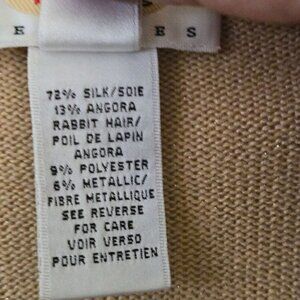 Talbots Vintage Gold Metallic Silk Blend Open Front Cardigan Sweater Size 10p. Pit to pit 21", shoulder to hem 21", Lightweight, Classic, Silk/Angora/ Metallic. Good Pre-Owned Condition
