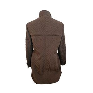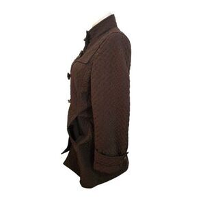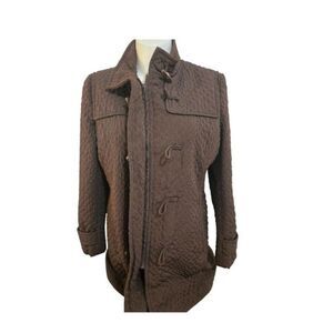 Quilted vintage jacket by Talbots in a brown poly material with a mock collar and side pockets. Zip and button front closure. Machine washable. Normal wear. Please see all photos for details.