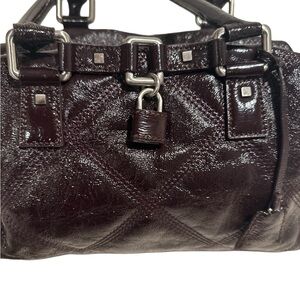 Talbots women's leather bag is made of dark burgundy, quilted leather with silver-toned hardware. It features a padlock detail and double handles.