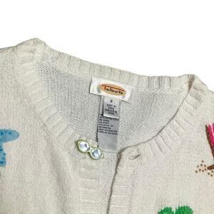 This charming Vintage white cardigan by Talbots features lively embroidered designs that bring a touch of whimsy to its classic style.