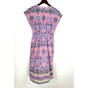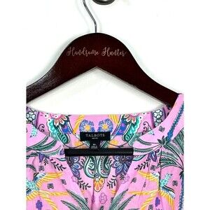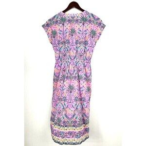 This beautiful Talbots Voile Dress in pink is perfect for any occasion. The dress features a V-neckline and cap sleeves, with a pullover closure for easy wear. The elastic waist accent adds a touch of comfort, while the graphic print of a bird and palms adds a tropical touch. The dress is made of 100% cotton and is lightweight, making it perfect for summer, fall, or spring. It has a midi length and a petite fit, with a flare style. The dress is also lined and has pockets, making it practical and functional. Whether you're traveling, attending a wedding, or just enjoying a casual day out, this dress is a great choice