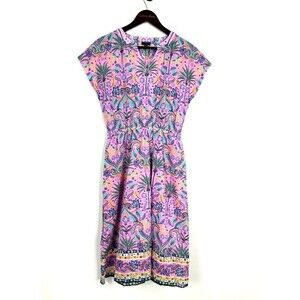 Talbots Voile Dress Pink Bird And Palms Women Sz MP Petite Fit Flare Tropical N4