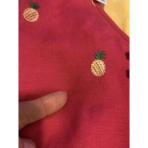 This vintage Talbots dress features a delightful pineapple pattern, perfect for summer occasions. The sleeveless V-neck dress is made of a linen blend and accented with beautiful embroidery. It has a zip closure and falls just below the knee, making it suitable for various events such as parties, cocktail events, or casual outings.