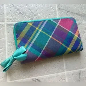 Vibrant Talbot plaid wallet featuring a bow accent on zipper