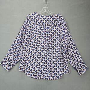 Talbots White Blue Shirt Sheer Blouse Multicolor Geometric Print Classic Long Sleeves Hidden Button Up V-Neck Women's Plus 1X Lightweight Top