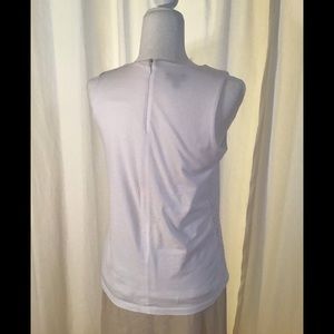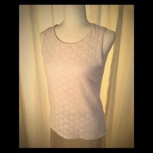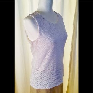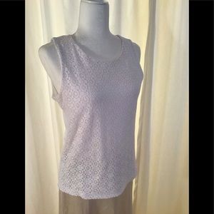 This white shell from Talbots has eyelet panel front, is fully lined both front and back. Crew neck, hip length. Back zipper closure. Front 76% cotton, 24% nylon. Back 60% cotton, 40% modal. Lining 60% cotton, 40% modal. Hand wash cold. Worn very few times.