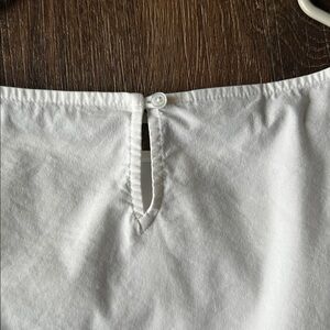 Elegant white top with ruffle trim. Three-quarter sleeves. Perfect for casual or formal wear.