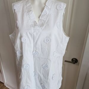 Elegant white top with ruffle V-neck. Features floral embroidery. Sleeveless design.