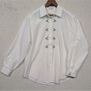 Celebrate the season in style with this Talbots white button-up blouse in size Medium. Featuring festive embroidered pumpkins, vines and acorns along the front button placket and cuffs, this blouse is a charming addition to your fall wardrobe. Perfect for casual wear, the office, or holiday gatherings.