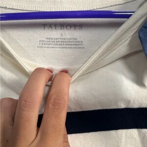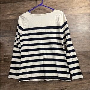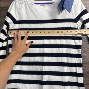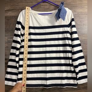 Chic navy and cream striped top. Accented with a denim bow on the shoulder. Ideal for everyday style.