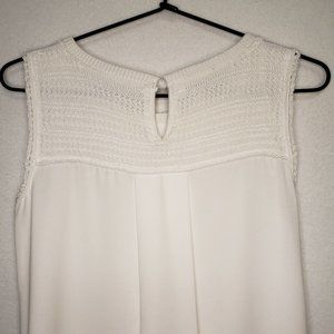 Talbots Petites White Round Neck Tanktop with Crochet Yoke, Knit Front, and Chiffon Back. Keyhole Single Button Back Neckline. Cotton sweater front, and polyester in back.