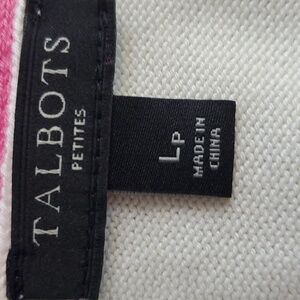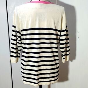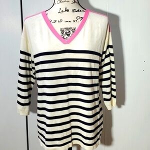 Talbots- White/Black Stripes Pink Trim Vneck Sweater Preppy Mod Sz.LP