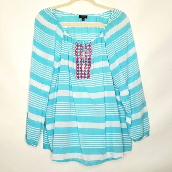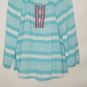 Talbots Woman Beaded Striped Top Size 2X Blue White Boho Popover Coastal. Super lightweight, relaxed cotton shirt.