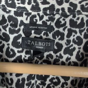 This Talbots button-up shirt is in a size 18 with an animal print design. It features long sleeves, a collared neckline, and a wrinkle-free, non-iron cotton blend material. The shirt is machine washable and comes in multicolor. The brand is Talbots, and it is a regular size fit for women.