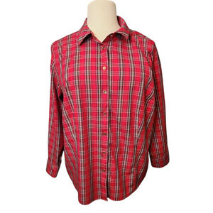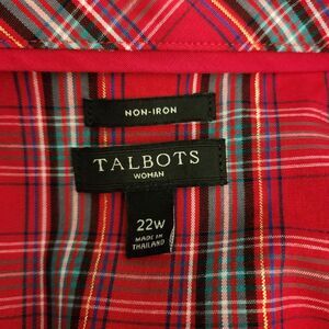 Talbots Woman Button-Up Plaid Shirt Sz 22W Red Multicolor Gold Metallic Non-Iron