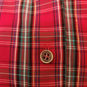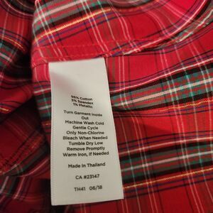 This is a button-up shirt from Talbots Woman. It is a cotton blend non-iron fabric with a red/multicolored plaid pattern, with a gold metallic thread running throughout. The shirt has gold-toned buttons and long button cuff sleeves. It is in excellent pre-owned condition.
