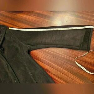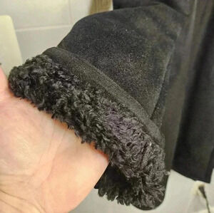 Long faux suede fully sherpa lined black coat, front slit pockets, button closure, large sherpa collar. Decorative stitching and back slit. Excellent used condition.