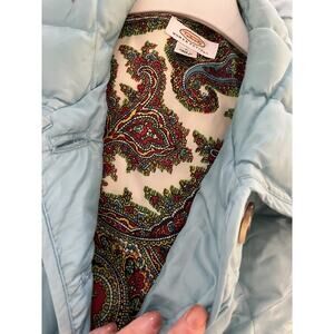 Excellent condition. 2 front pockets. Collar. Paisley lining. 22" pit to pit, 24" shoulder to hem. Duck down, Nylon, polyester