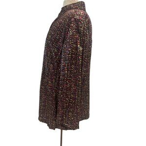 • Colors: Black base with multi-color abstract print (berry, purple, gold, olive)