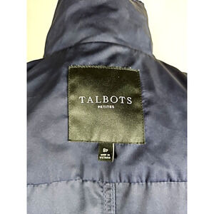 Elevate your outdoor wear with this elegant Talbots windbreaker. The navy blue jacket features a hood and zip closure, making it perfect for casual occasions. The jacket is made of lightweight polyester fabric, making it ideal for fall and spring seasons. The mid-length jacket has long sleeves and is machine washable for easy care. The solid pattern and classic design make it a timeless piece for any wardrobe. The jacket is perfect for women's size 8P and is a regular fit. Talbots is a designer brand known for its quality and style, making this jacket a must-have for any fashion-forward woman.