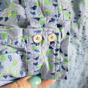 Talbots Woman Size LP 1/2 Button Down Blouse with Pleated Collar & Front Trim Nautical Flag Blue and Green Swiss Dot Fabric. Long Sleeve with Cuff.
