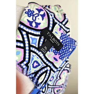 This Talbots sleeveless dress in size M petite is perfect for summer, fall, or spring occasions like travel, parties, or casual wear. The knee-length dress features a round neck, zip closure, and a colorful geometric print cotton fabric that is stretchy and unlined. It is machine washable and designed in a fit & flare style with a sleeveless design, making it a versatile and comfortable choice for any petite woman looking for a stylish and vibrant dress option.