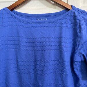 Talbots Women Blue Textured Stripe Button Accent Sleeve Cotton Blouse Medium P. Measurements Shoulder to shoulder: 13" Underarm to underarm: 18" Length: 23" Sleeve: 10" Offers always welcome! Measurements are approximations taken while hanging