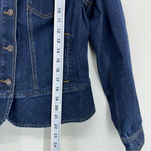 This Talbots denim jacket blends classic structure with casual charm. Crafted in a dark wash denim, it features a tailored fit with a flattering peplum hemline and functional front pockets. Perfect for layering over dresses or pairing with trousers for an elevated everyday look.