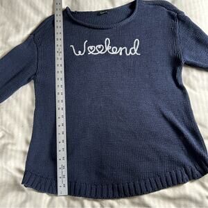 Gently used navy blue crewneck sweater with shirt-tail hem.