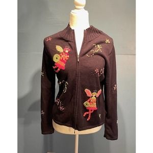 Talbots Women Size Small Christmas Front-Zip Sweater Black w/ Embroidered Angel