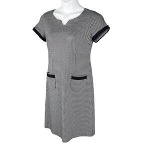 Talbots 10 Houndstooth Black White Sheath Dress Fringe Trim Short Sleeves Pockets Office Business Casual Career Wear Old Money