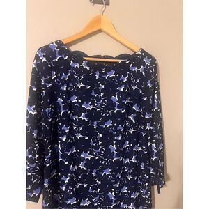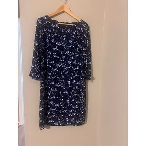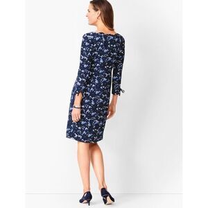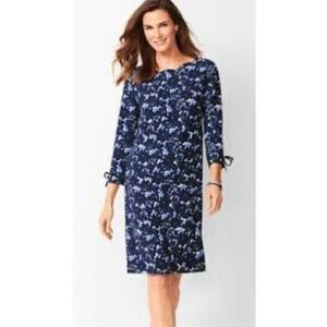 Talbots Women's 10 Scalloped Neck Shift Dress Blue Black Floral 3/4 Bow Sleeves