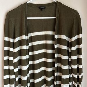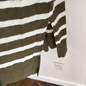 Talbots Women’s 100% linen knit duster long open cardigan Olive Knit stripped Sweater medium EUC