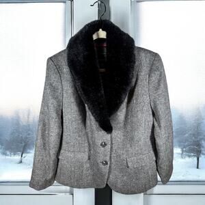Talbots Women's 16 Gray Herringbone Aberdeen Shetland Blazer Faux Fur Collar