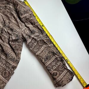 Very very cool 90s style blazer with one button and 2 front pockets. Has a cool tan & brown print and is collarless. Each shoulder has a sewn-in pad under the lining.