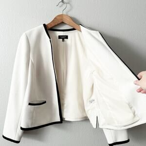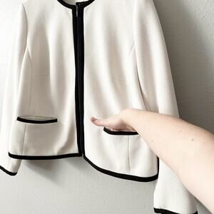 Cream knit blazer jacket with black piping trim. Front pockets. Front zip closure. Lined.