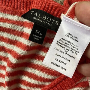 Elevate your wardrobe with this beautiful Talbot's sweater. The coral striped design adds a pop of color to any outfit, while the long sleeves and lightweight material make it perfect for any season. Made from a linen blend, this pullover is both comfortable and stylish, and the petite size ensures a perfect fit. Ideal for women of all sizes and ages, this sweater is a must-have addition to any wardrobe.