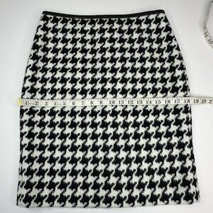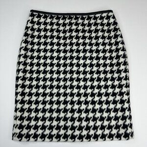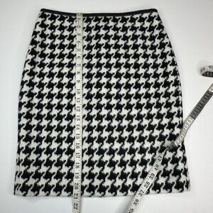Talbots women's size 4 petite skirt. It has a houndstooth print, thick stretchy fabric, color is black and white, straight pencil style, Y2K 07/2016, knee length, back slit, lined with back zipper closure. Materials shell 50% wool, 50% polyester, lining 100% polyester. Care dry clean only. CA# 23147. Condition is preloved very good as shown in pictures. Please preview the measurements to ensure fit.