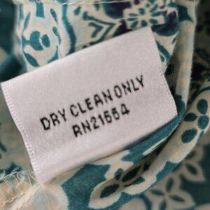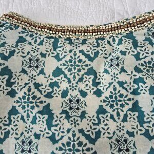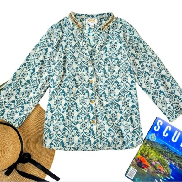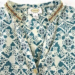 Talbots Women's Blouse Size Small Petite SP Blue Green Tropical Wood Beading