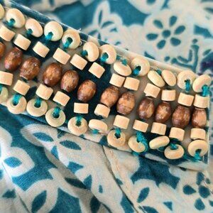 The neckline is adorned with mini wood beads