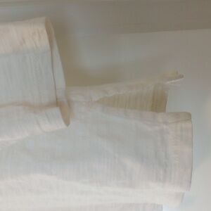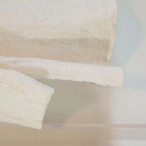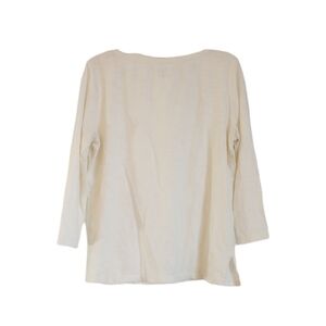 This is a cream Talbots women's T-shirt with 3/4 sleeves. It has lace detail on the chest and side slits on the sides. It is lightweight and 100% cotton. It is a size medium. It is in pretty good condition.