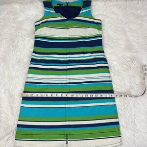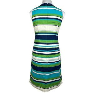 Talbots women's size 4 petite, it is a sheath style, sleeveless, blue, white and green stripes, lined, v-neckline, thick fabric, hidden pockets, stretchy, front slit, back zip closure with center seam accent. Materials shell 97% cotton, 3% spandex, lining 100% polyester. Care dry clean only. Condition is preloved very good as shown in the pictures. Please preview the measurements to ensure fit. Size 6 dress form used in photos.